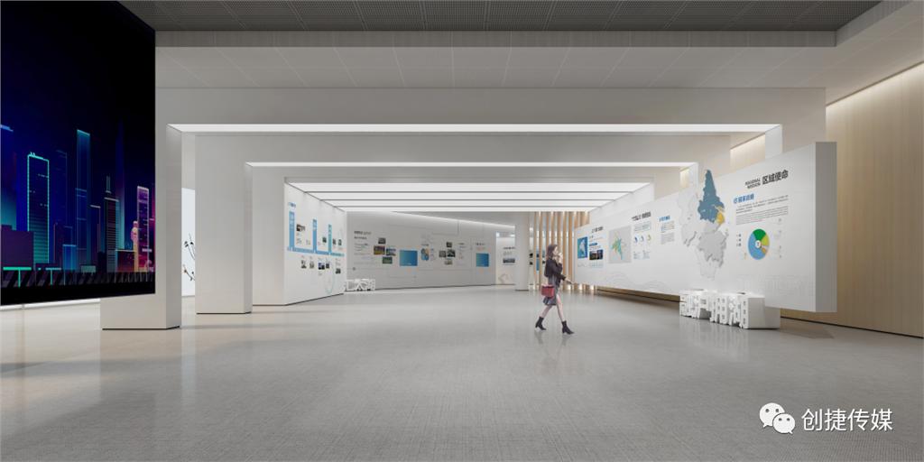 展廳以深灰、淺灰和白色為主色調(diào),設(shè)計大幅壁掛沙盤及江南韻的大空間,同時以明暗對比顯示空間層次,增加開合對比的效果。